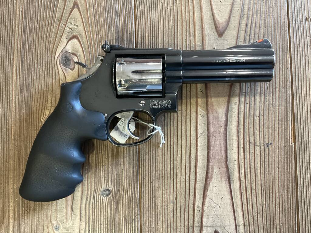 USATO – Revolver S&W mod. 586 serie 4 cal. 357 mag. tamburo da 6 colpi canna 4″ doppia azione tacche di mira regolabili, particolare il tamburo il cane e il grilletto sono lucidi, guancette in gomma . Arma classificata sportiva .. buone condizioni.